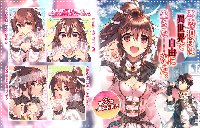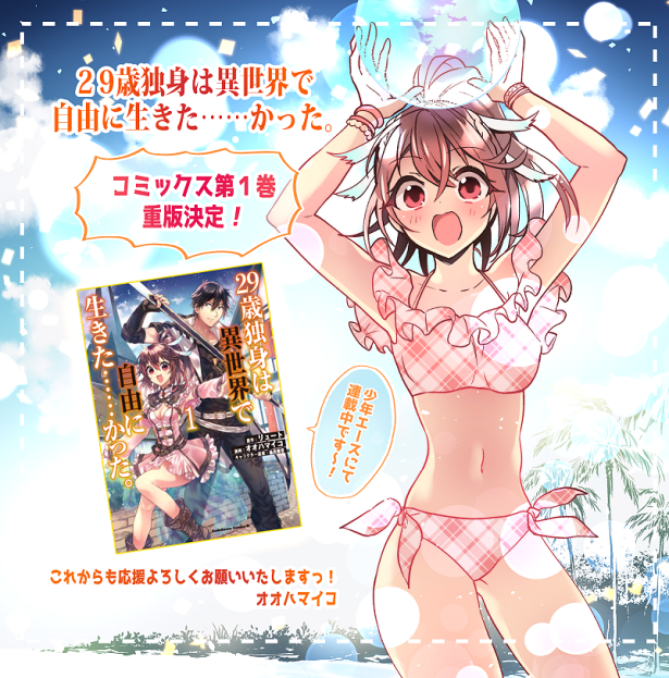 (※こちらは特典がありません。ご注意ください。) 29歳独身は異世界で自由に生きた……かった。③ KADOKAWA (2020/9/26) 2020.06.07 Sun 17:41:04 14話掲載中です!少年エース7月号にて『29歳独身は異世界で自由に生きた……かった。』最新14話が掲載中です。 マールちゃんはどうなったの!?と、超気になるところで2ヶ月もお待たせして申し訳ありませんでした…; これからも頑張りますのでよろしくお願いいたします。 2020.05.11 Mon 18:57:11 お休みのお知らせ2020.03.21 Sat 19:11:03 お休みのお知らせ2020.02.18 Tue 17:42:31 コミックス発売中です29歳独身は異世界で自由に生きた……かった。② KADOKAWA (2020/1/24) 『29歳独身は異世界で自由に生きた……かった。』コミカライズ版第②巻絶賛発売中です✨そして同じく絶賛発売中の少年エース2020年3月号にて『29歳独身は異世界で自由に生きた……かった。』第12話はセンターカラーで掲載されております! 好評発売中のコミックス第②巻の続きが読めますっ!続きが気になるからはぜひ本誌をチェックしてくださいねっ✨ そしてなんと…!『29歳独身は異世界で自由に生きた……かった。』コミックス第②巻の重版が決定したらしいと担当さんに教えていただきました…びっくりです!皆様本当にありがとうございます!! ③巻収録分も頑張って描いていかねば。。。 2020.01.24 Fri 14:18:12 『29歳独身は異世界で自由に生きた……かった。』のコミックス第②巻 書店特典まとめコミカライズ版『29歳独身は異世界で自由に生きた……かった。』第②巻、2020年1月24日発売です! この記事では各書店さまの特典をまとめます! 頑張って色々と描きおろししました~っ✨発売日が楽しみですね♪ぜひぜひよろしくお願いいたします~~っ✨