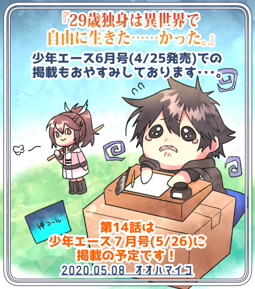 Amazon・kindleでも取り扱い中です! (※こちらは特典がありません。ご注意ください。) 29歳独身は異世界で自由に生きた……かった。④ KADOKAWA (2021/2/26) 2021.02.18 Thu 18:16:46 余寒の予感年末年始はコミックス作業で超バタバタしておりました関係で、すっかり余寒見舞いの時期になってしまいました 創作干支娘ちゃん、今年はあんまり凝れなかった…そしてまたしても前髪ぱっつん…!好きなんだ…。。。(笑) 本年もよろしくお願いいたします!! 2020.10.15 Thu 19:32:42 なんと少年エース11月号表紙です!こちらでのお知らせがすっかり遅くなってしまいましたが、少年エース11月号好評発売中ですっ! オオハマイコ、マンガ家人生初の『表紙』描きました…ありがとうございます!!めちゃくちゃ嬉しいです!!(泣) ちょっと自分語りをしますが、少年エースとの出会いは中学生の頃…『新世紀エヴァンゲリオン』にハマって付録の下敷き欲しさに購入したのがきっかけでした。 憧れの作品が沢山掲載されている雑誌に、自分の描いた絵が表紙に来る日が来るなんて!!何とも感慨深いです…。 これからも頑張ります!!応援よろしくお願いします。 そしてそして、『29歳独身は異世界で自由に生きた……かった。』第18話掲載中です!! 現在発売中の③巻の続きがこの号で読むことができます!よろしくお願いいたします~~~っっっ。 2020.09.18 Fri 00:05:00 『29歳独身は異世界で自由に生きた……かった。』のコミックス第③巻 書店特典まとめコミカライズ版『29歳独身は異世界で自由に生きた……かった。』第③巻、2020年9月26日発売です! この記事では各書店さまの特典をまとめます! 春にお休みした関係で、コミックスの発売も予定より遅れてしまい申し訳ありませんでした。 せめてなにか…と思いまして、頑張って書店特典描きおろししました!!なにとぞよろしくお願いいたします!!